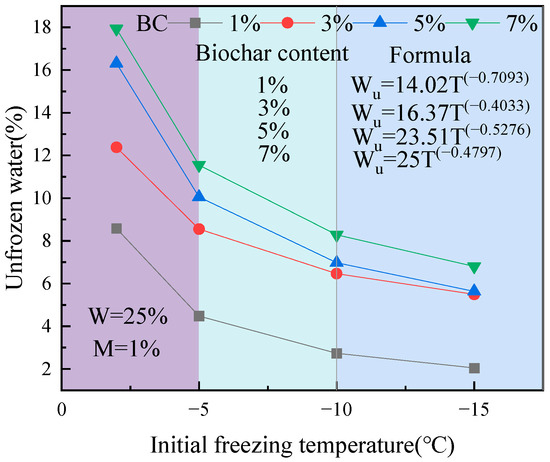 Some studies have previously shown that biochar can increase unfrozen soil water [24]. The q-values were calculated by selecting 25% and 30% moisture content and the corresponding freezing temperatures. The p-value corresponding to soil with 25% water content was then calculated from the 25% water content and its corresponding temperature. The formula for unfrozen water in soil with 25% moisture content for different biochar contents can be calculated from the q and p values. The formula and results of unfrozen water calculations for different biochar contents are shown in Figure 10. From Figure 8, it can be seen that the greater the biochar content, the more unfrozen soil water there is, and as the absolute value of the temperature gradually increases, the unfrozen soil water gradually decreases.