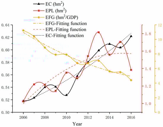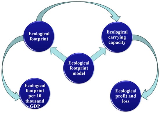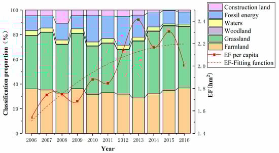 - Equilibrium factor. The productivity gap between different types of lands is large, and they cannot be directly compared with each other. Therefore, it is necessary to combine different types of lands with global equilibrium factors from a global average perspective in order to transform various types of lands with different productivity levels into an equilibrium value that can be compared between different types of lands. According to relevant research [24,25], the equilibrium factors are as follows: the water area is 0.35, forest land is 1.36, grassland is 0.48, construction land is 2.15, arable land is 2.15, and fossil energy land is 1.36. This parameter is stable during a certain period of time.