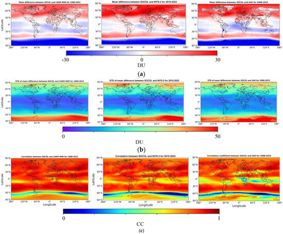 Global distribution of mean differences or MD (a), SDD (b), and correlation coefficients (c) between TOC by SOCOLv4 modeling and satellite observations (CAMS MSR for 1980–2022—left, IKFS-2 for 2015–2022—middle, IASI for 2008–2023—right).