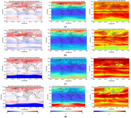 Seasonal global distribution of mean differences or MD (left), SDD (center), and correlation coefficients (right) between TOC by SOCOLv4 modeling and combined satellite observations in CAMS MSR dataset in winter (JJA, (a)), spring (MAM, (b)), summer (JJA, (c)) and autumn (SON, (d)) for 1980–2022.
