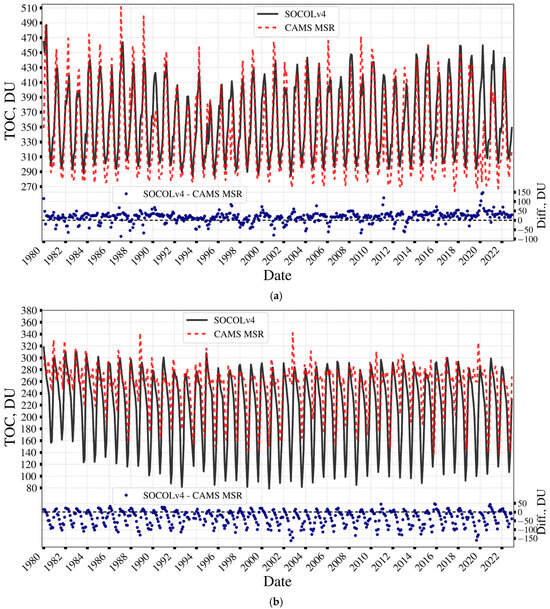 Monthly mean TOC averaged in zones 70–90° N (a) and 70–90° S (b) by SOCOLv4 modeling (ensemble member mean) and CAMS MSR dataset for 1980–2022 and their differences (SOCOLv4 minus obs.).