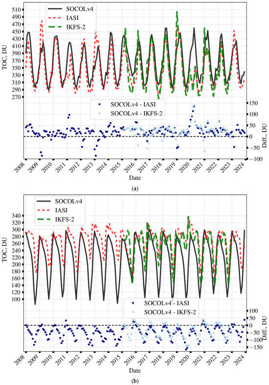 Monthly mean TOC averaged in zones 70–90° N (a) and 70–90° S (b) by SOCOLv4 modeling (ensemble member mean) and satellite observations (IASI—2008–2023, IKFS-2—2015–2022) and their differences (SOCOLv4 minus obs.).
