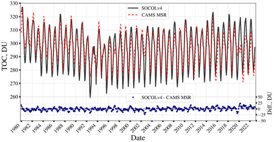Monthly and globally averaged mean TOCs from SOCOLv4 modeling (ensemble member mean) and CAMS MSR and their differences (SOCOLv4 minus CAMS MSR).