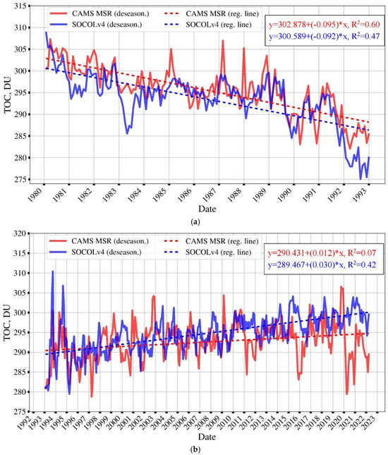 Deseasonolized monthly and globally averaged mean TOCs from SOCOLv4 modeling (ensemble member mean) and CAMS MSR for 1980–1992 (a) and 1993–2022 (b) and their regression lines.
