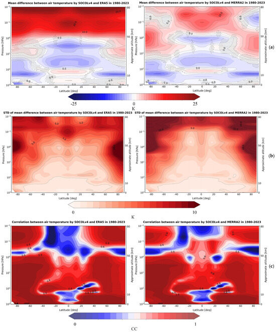 Zonal distribution of mean difference ((a), MD), its SDD (b), and correlation (CC, (c)) between air temperature from SOCOLv4 and reanalysis (ERA5 on the left and MERRA2 on the right) data for 1980–2023; dots indicate statistically insignificant differences according to t-test (0.95 confidence level).