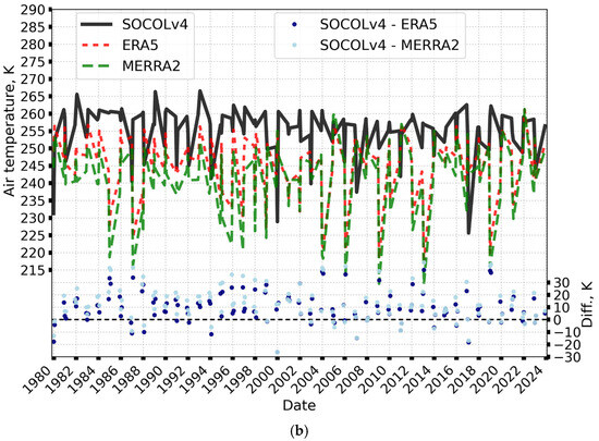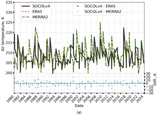 Since the largest differences between TOCs from SOCOLv4 modeling and satellite measurements were found in polar regions during polar nights, it was proposed that one possible source of uncertainty is related to the modeling of air temperature spatiotemporal distribution. In the following sections, the zonal and vertical temperature distribution for the period of 1980–2023 from the reanalysis data (ERA5 and MERRA2) and SOCOLv4 output are analyzed.