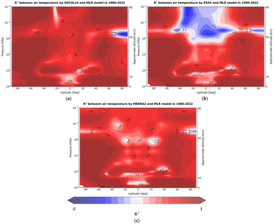 Figure 9 presents the zonal and vertical distribution of the determination coefficient (R2) between air temperature from the SOCOLv4/reanalysis data and MLR model for 1980–2022. R2 is high and ranges from 0.7 to 0.9 in most of the territories. The lowest R2 (0–0.4) was found for ERA5 data above ~50 km in the tropical region. By contrast, neither the MERRA2 nor the SOCOLv4 data have such low R2 in this region. Note that, even though there are zones where the R2 is about 0, the MLR model is significant for the whole area. The low R2 and statistically significant MLR probably mean that there is no linear relation between the dependent parameter (air temperature) and predictors used in the MLR model. Accordingly, the change of air temperature above 50 km in the tropics found in the ERA5 data is more complex and cannot be reproduced by the MLR model used (Figure 9b). An extra predictor should probably be added to the MLR model. Interestingly, R2 is high in the same region for the SOCOLv4/MERRA2 and MLR model (Figure 9a). This probably means that, according to the SOCOLv4 and MERRA2 data, air temperature changes differently in this area in comparison to the ERA5 reanalysis.