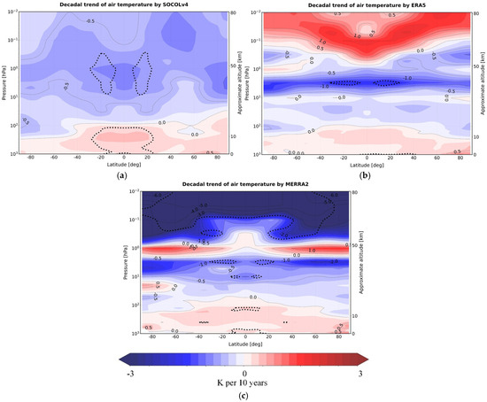 According to Figure 10, the zonal distribution of air temperature trends differs between the three datasets, predominantly above 1 hPa. Significant positive trends in air temperature can be found in the tropical troposphere (by SOCOLv4 and MERRA2, up to 100 hPa) and negative trends can be found in the tropical stratosphere (by all datasets, above 10 hPa). Note that in the troposphere the air temperature trends from all the datasets are relatively close to each other and constitute 0.3–0.4 K per 10 years. However, the trends in the stratosphere differ significantly. For example, according to the SOCOLv4 data (Figure 10a), negative trends (0.6–0.7 K per ten years) with a determination coefficient higher than 0.5 are observed at levels from ~50 to 0.1 hPa. By contrast, according to the ERA5 data (Figure 10b) the significant negative trends in the stratosphere (1 K per ten years and more) can be seen in a thin layer from 10 to 1 hPa. Almost the same trends can be seen in the MERRA2 data (Figure 10c). Regarding the differences between the reanalysis datasets, there is a strong negative trend, with R2 > 0.5, in a layer from 0.1 hPa and above in the MERRA2 data, when there is no such trend in the ERA5 data. According to modern investigations [43,44], air temperature above ~50 km has a decreasing tendency. In this regard, MERRA2 may reproduce air temperature in the mesosphere better than ERA5. According to Figure 10, SOCOLv4, in a free run, reproduces air temperature rises in the troposphere, with decreases in the layer above 10 hPa. However, the model does not reproduce zones of high negative trends above 0.1 hPa.