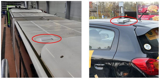 Pollutrack sensors (inside the red circle) on the roof of a bus (left) and of a car (right).