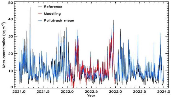 These results confirm the ability of Pollutrack mobile sensors to map the PM2.5 of Teltow district. The mean value of PM2.5 is 10.9 µg.m—3 for Pollutrack sensors and 10.2 µg.m−3 for the reference station at Blankenfelde-Mahlow station for the 2021–2023 period, with only a few pollution peaks above 30 µg.m—3. These values are relatively low, indicating that the mean air quality was quite acceptable in this district during that period.