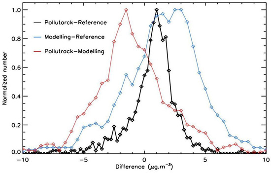 Figure 3 presents the UBA reference measurements, the average measurements from the 4 fixed Pollutrack stations, and the modelling results. The Pollutrack sensors have measured the same time evolution of the PM2.5 as the UBA reference station for the 2021–2023 period, with a mean difference between the two datasets of 0.7 µg.m−3 and a standard deviation of 2.3 µg.m−3. The mean wind directions are mainly between the northwest and southwest; thus, the Pollutrack fixed stations and the UBA reference station are in the same air masses globally. Between the two measuring points are some commercial areas with industrial and logistics companies and highways, but their contribution is probably diluted during the air transport. The PM2.5 time evolution of the different sensors and the modelling calculations are also in excellent agreement for the year 2022, confirming the self-consistency of all the results when considering the measurement uncertainties. Figure 4 presents the histograms of the differences between the various sets of data, and Table 2 presents the main statistics. The histograms have a Gaussian shape with a centre relatively close to zero. The dispersion between Pollutrack and the reference data is low. The dispersion is higher but acceptable when considering the modelling data, confirming that the model is less accurate than real measurements.