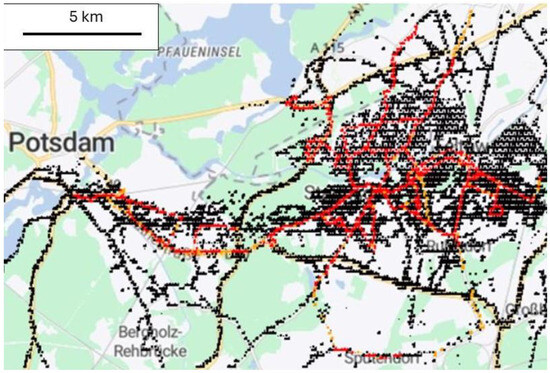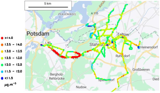 The Pollutrack mobile sensors were mounted on two different types of vehicles, the roofs of cars that performed sparse measurements while travelling on different roads around Teltow and up to Potsdam at the west of Teltow and the roofs of buses that travelled on regular routes. The data, when available, are integrated on a square of 100 m side length. Figure 5 presents the locations of the measurements; the black dots represent the sparse measurements from cars and the red ones represent the regular measurements from buses. The concept of random measurements to produce daily or yearly maps of PM2.5 pollution works well in the case of a large number of vehicles with sensors, typically one hundred or more depending on the town size, as performed in other European cities. On the other hand, when the number of cars is too low, as for Teltow, although their travel covers a large part of the district, only some sporadic events could be accidentally detected. The number of measurements in a given location appears too low to apply statistics for producing the spatial PM2.5 maps. Thus, using the roof of buses is more appropriate for studies in midsize cities. Also, trucks for garbage collection could be considered in the future for that purpose, as currently experienced in Lille, northern France. Thus, we will consider the regular measurements only.