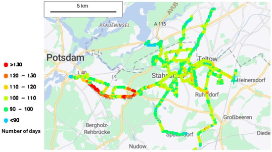The second parameter to evaluate the sanitary risk of PM2.5 exposure is the number of days per year above the 15 µg.m−3 daily ceiling that the WHO recommends not to exceed more than four days per year. Figure 8 shows that the highest number of days occurs where the mean mass concentrations are higher, on the main roads and motorways, and for the hot spots inside the city. For the mean of the fixed Pollutrack stations and the UBA reference station, the number of days per year is 75 and 65, respectively. As with mass concentration data, these values are below the values from mobile sensors, where 90 days is the lowest value detected in the city. The highest number of days, above 130, is recorded on the southwest motorway with levels up to 40% higher than in the centre of Teltow city. Il should be noted that there is no direct residential development near this highway.