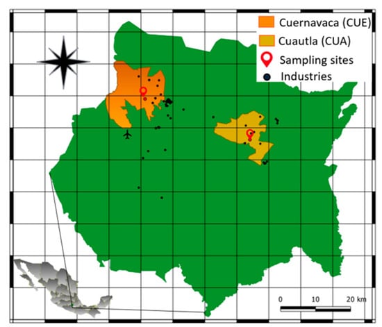 The Metropolitan Area of Cuernavaca encompasses 52% of the inhabitants of Morelos (983,365 inhabitants); while Cuautla has only 25% (475,441 inhabitants) [56,57]. Cuernavaca (CUE) is the capital of Morelos where the main economic activity is tourism followed by industries such as cement, pulp paper, and automotive; while Cuautla (CUA) has important activities related to agriculture of several crops, including sugarcane associated with an operating sugar mill, several inefficient artisanal brick kilns, and livestock and the food and beverage industry are other economic activities [56,57]. The distance between them is 54.5 km (Figure 1).