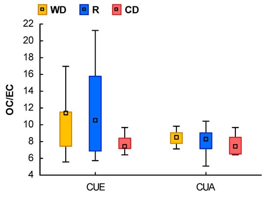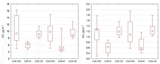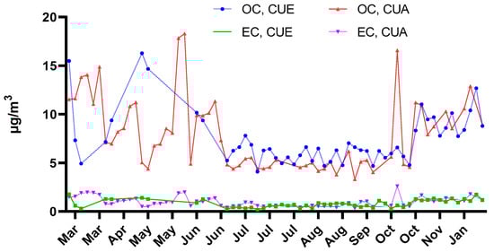 The OC/EC values are the greatest in comparison to other studies, particularly during the WD and R seasons in CUE, as can be observed in Table 1; although similar OC/EC ratios have been reported in Toronto and Vancouver with values of 10.5 and 11.2 on rainy days [72], in Medellin in the rainy season [29], and in Portugal and Austria [24].