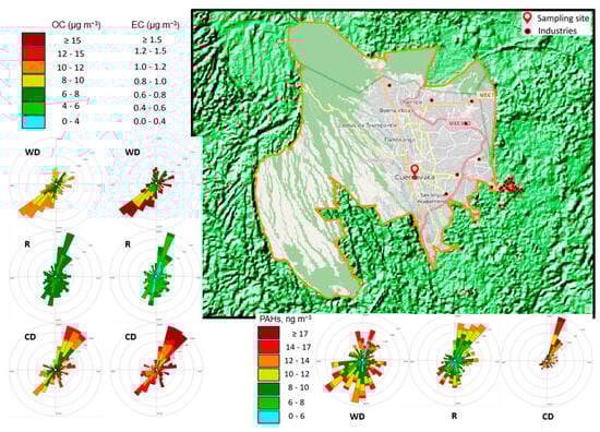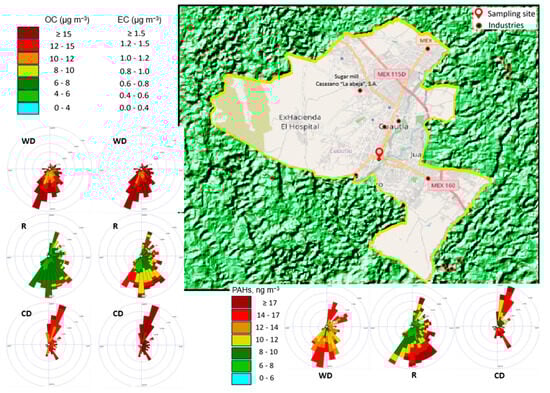 Figure 4 and Figure 5 illustrate the concentration roses of organic carbon and elemental carbon for both sites. In CUE, OC and EC concentrations during the R and CD seasons were predominantly influenced by emissions from the northeast (NE), where the industrial zone is located, promoting bad air quality. In contrast, during the WD season, emissions from the southwest (SW) had a significant impact. Local emissions of OC and EC in CUE during the WD season are particularly pronounced, likely due to the influx of tourists, as previously noted, but also the emissions from the sugar mill named Zacatepec located in the south.