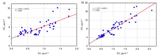 where: POC is primary organic carbon, OC is organic carbon, EC is elemental carbon (used as a marker for primary sources), (OC/EC)min represents the minimum OC/EC ratio and SOC, which were derived using a linear regression applied to OC/EC ratios (percentiles 0–10%) of samples with the lowest ratios [29,61].