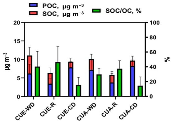 The secondary organic carbon fraction was estimated using the EC tracer method, with the ordinary linear regressions of a subgroup of data with the lowest OC/EC ratio, which focuses on primary emissions (as outlined in Equations (2) and (3)). The underlying supposition is that the days with the minimum OC/EC ratio had minimal contributions from secondary organic carbon (SOC); consequently, the slope of the regression provides an estimate of the OC/EC ratio attributable to primary emissions [29]. The ratios of (OC/EC)min for CUE were 5.6 for WD (R2 = 0.89), 6.3 for R (R2 = 0.96), and 6.5 for CD (R2 = 0.80). (OC/EC)min ratios for CUA were 7 for WD (R2 = 0.99), 5.7 for R (R2 = 0.99), and 6.4 for CD (R2 = 0.99).