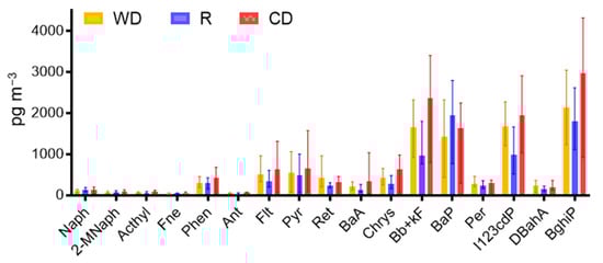 - Finardi, S.; Radice, P.; Cecinato, A.; Gariazzo, C.; Gherardi, M.; Romagnoli, P. Seasonal variation of PAHs concentration and source attribution through diagnostic ratios analysis. Urban Clim. 2017, 22, 19–34. [Google Scholar] [CrossRef]