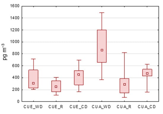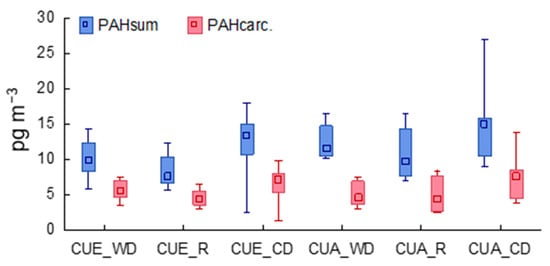 While CUE has a higher population density, CUA exhibited greater annual concentrations of the total analyzed PAHs (p = 0.03). The median concentration at CUE was 9.7 ng m−3, while CUA recorded a median of 11.2 ng m−3. This variation may be attributed to differing emission sources as was mentioned above, as CUE’s economy primarily relies on tourism and specific industries, such as cement, paper, tobacco, and soft drinks, whereas CUA’s economic activities encompass agriculture, livestock, and industry, with a major use of biomass burning.