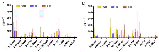 Seasonal median concentration of nitro-PAHs in PM2.5 in Cuernavaca (a) and Cuautla (b).