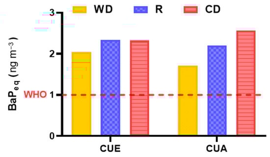 The unit inhalation cancer risk factor of BaP (URBaP) is defined as the number of people who will develop cancer from the inhalation of 1 ng m−3 of BaPeq within a lifetime of 70 years. The URBaP was suggested to be 8.7 × 10−5 by the World Health Organization (WHO) and 1.1 × 10−6 (ng m−3)−1 by CalEPA [67,68]. This means that 8.7 per 100,000 people with inhalational exposure to 1 ng m−3 of BaP over a lifetime of 70 years would have cancer [68].