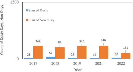 The numbers of dusty days at three different altitudes (≤1000 m, ≤3000 m, and ≤5000 m) for the years 2017 to 2022 were compared, and it was found that as the altitude increased, the number of dusty days also increased. The year with the highest number of dusty days was 2018, which had a total of four dusty days at ≤1000 m, a total of 30 days at ≤3000 m, and a total of 57 days at ≤5000 m. The data for 2022 were recorded only up to June; however, it was still predicted to be one of the dustiest years since it had a total of 5 days at ≤1000 m, 13 days at ≤3000 m, and 30 days at ≤5000 m, being relatively high only halfway through the year compared to the previous full years. Since no dust records were available for higher altitudes, dusty day readings at ≤5000 m were used throughout the study.