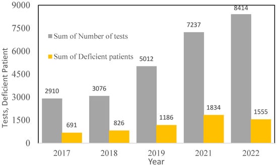Furthermore, patient data were gathered and compared with factors such as dusty days, non-dusty days, the number of tests conducted, and the number of VDD patients per specific year. It was found that the number of tests increased yearly. In 2017, a total of 2910 vitamin D tests were conducted. The number of tests per month ranged from the lowest (128 tests) in September to the highest (304) in May. In 2018, 3076 tests were conducted, with the lowest number of tests conducted in August (181) and the highest conducted in May (313). In 2019, the total number of tests increased to 5012, with the lowest number of tests conducted in January (352) and the highest in September (522). However, the total number of tests in 2020 decreased to 4406; this could be due to the COVID-19 pandemic restrictions in Bahrain. Notably, a significant increase in the number of tests was observed in 2021, with a total of 7237 tests conducted; the number of tests ranged from a low of 387 in February to a high of 816 in November. A total of 8414 tests were conducted from January to June 2022; the number of tests per month was observed to increase considerably, with the lowest number of tests in January (906) and the highest in May (1631).