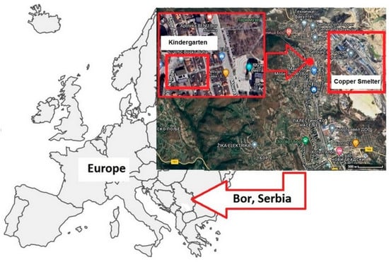 - Serbula, S.; Ilic, A.; Kalinovic, J.; Kalinovic, T.; Petrović, N. Assessment of air pollution originating from copper smelter in Bor (Serbia). Environ. Earth Sci. 2014, 71, 1651–1661. [Google Scholar] [CrossRef]