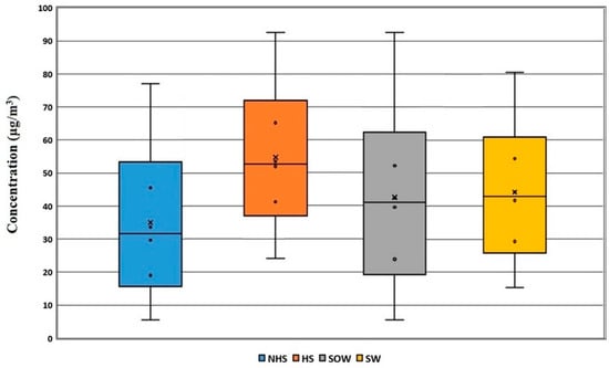 The difference between the PM10 levels during the HS and NHS periods is statistically significant, while the difference between the PM10 levels in the SW and SOW periods is not statistically significant (95% confidence level, shown in Figure 2). It should be noted that the PM10 sources in the copper smelter were not the dominant sources of PM10 in the urban center of Bor. Earlier measurements [] showed an average increase in PM10 by 10% during the heating season compared with the PM10 level in the non-heating season in Bor.