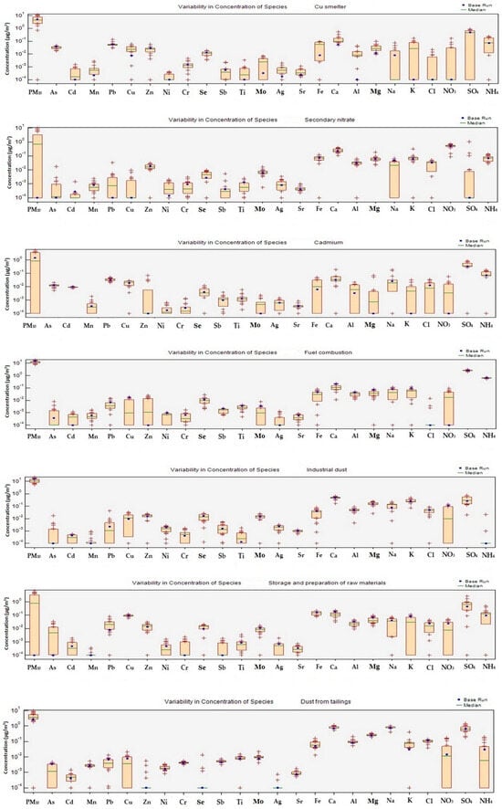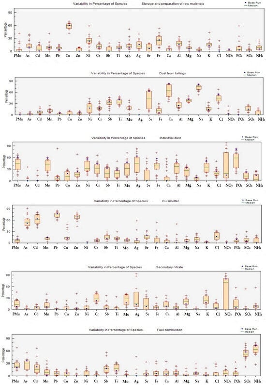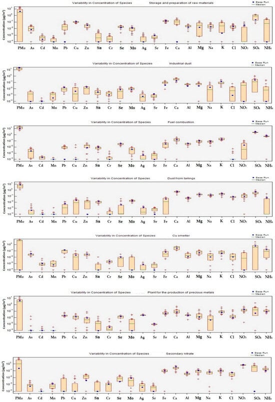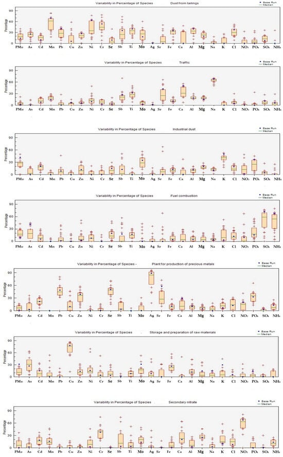 The bootstrap analysis results indicate that all factors align with the primary ones, with no unmapped factors, confirming that the selected number of factors is appropriate. Figure 3 presents the profiles of the identified factors obtained after the bootstrap run. It can be seen (Figure 3) that the secondarily formed nitrates have a narrow interquartile range (Q1–Q3). A narrow interquartile range is also given by the species produced by fuel combustion, during which a considerable amount of SO42− and NH4+ is released. Through further photochemical reactions these species create another type of secondary aerosol particle: secondary sulfates. A wider interquartile range and greater dispersion of results were observed for species originating from other identified sources. The greatest dispersion of results was observed for species originating from industrial emitters. A significant dispersion of the results of certain types of markers was also observed in the profiles of dust factors from tailings and the storage and preparation of raw materials. The wide interquartile range in these species results from metrological parameters (wind direction and speed, temperature, humidity, etc.) rather than human factors [,].