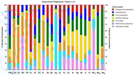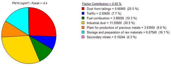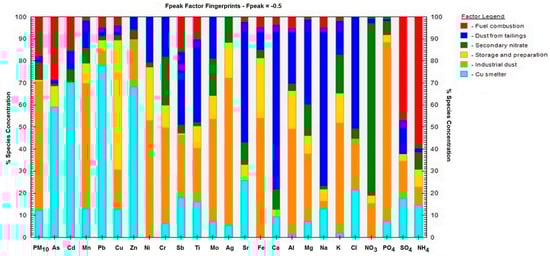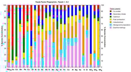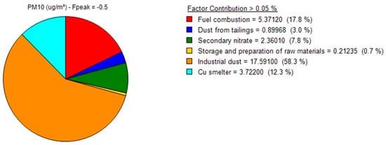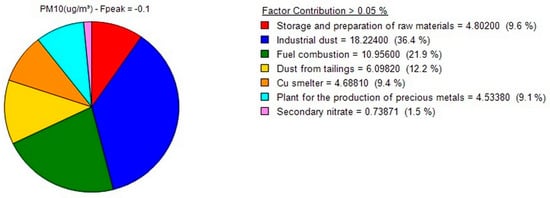 PMF 5.0 is a factor analysis model that solves the chemical mass balance equations using a weighted least-squares algorithm and by imposing non-negativity constraints on the factors [,,]. The interruption in the operation of the copper smelter made it possible to check their influence on the level and content of pollutants in the air. In this study, the PMF model was performed on each sampling season and observation period separately to identify the major sources of ambient PM10 and quantify their relative contributions to total PM10 mass.