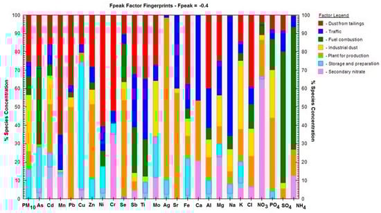 The percentage contribution of each identified factor in the total mass of PM10 is shown in Figure 7. The identified factors during the heating season, arranged in descending order, are industrial dust (36.5%), fuel combustion (22.0%), dust from tailings (12.1%), storage and preparation of raw materials (9.6%), smelting (9.3%), silver (9.1%), and secondary nitrates (1.4%). Figure 8 shows a summary of the individual species in the identified sources during the heating season.