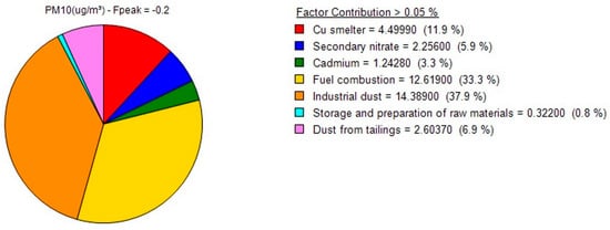 The factor “Secondary nitrates” with a share of 6.0% in the total mass of PM10 as the dominant species contains NO3− (78.5%), Zn (25.7%), Fe (21.7%), Ag (19.7%), and Mn (19.6%). The “Industrial dust” is the factor that contributes the most to the total mass of PM10 (38.0%), which is to be expected considering that it is a period when the copper smelter was in operation. The dominant species in this factor are Ag (49.3%), K (48.1%), Ni (34.4%), Mo (33.3%), and Se (28.4%) predominate.