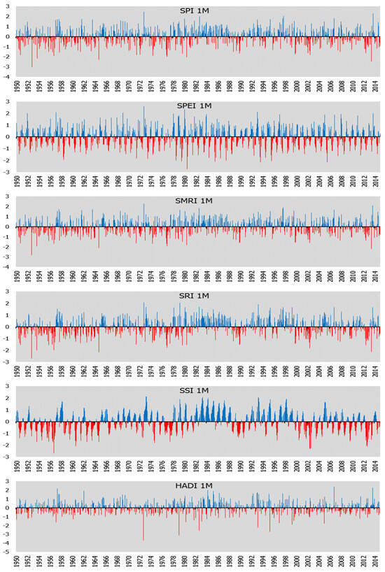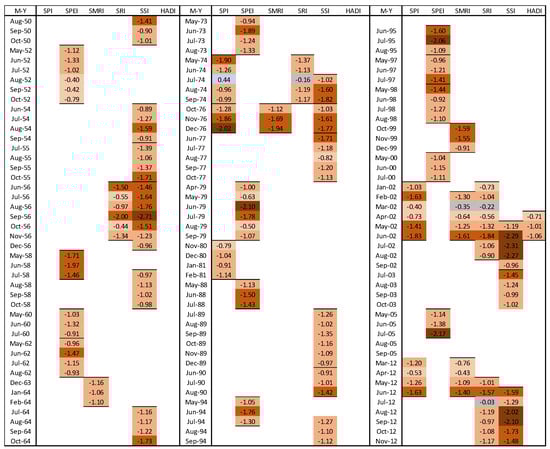 Considering the abnormal dry, moderate, severe, extreme, and exceptional drought categories, the droughts were identified in different durations based on each drought index (Figure 3 and Figure 4). According to SPI, the most prolonged dry period was six consecutive months, from January to February 2002 and May to June 2002. There were two two-month dry periods with the one-month normal condition between May to June 1974 and August to September 1974. The other long dry periods were identified from October to December 1976 and November 1980 to February 1981. The last relatively long dry period occurred in March 2012 and May to June 2012, with a one-month abnormal dry condition in between. For the SPEI, the most severe and long dry period occurred from April to September 1979. Generally, based on SPEI, long-term droughts were identified in 1952, 1958, 1960, 1962, 1973, 1979, 1988, 1994, 1995, 1997, 1998, 2000, and 2005. According to the results for SMRI, there are relatively long dry periods for SRI compared with the other drought indices. The 1963–1964, 1973, 1976, 1999, 2002, and 2012 were dry years based on the SMRI. The SRI results indicated that 1956, 1974, 2002, and 2012 were dry years with the deficit in runoff and streamflow in the UCRB. Lack of soil moisture, which is reflected in the SSI, was observed in almost a significant portion of the 50s decade, including 1950, 1954 to 1956, 1958, 1964, 1974, 1976, 1977, 1989, 1994, 2002, 2003, 2012. The longest and the most severe deficit in soil moisture was associated with 1956 from June to December. The most extended dry period based on the HADI lasted three consequence months from April to June 2002. In this period, all the drought indices except SPEI showed dry conditions (Figure 4).