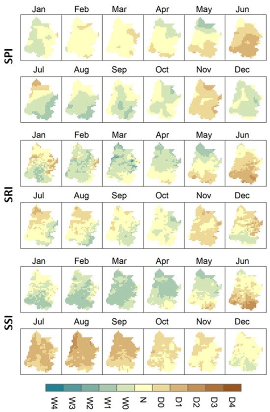 Spatial pattern of drought based on standardized univariate indices (SPI, SRI, and SSI) in the UCRB.
