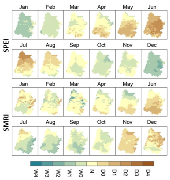 SMRI reflects the anomalies in immediately available water, which is the sum of rainfall and snowmelt. The dry conditions in the warm seasons (e.g., June) can be associated with a rainfall deficit or high temperature. Since June is one of the driest months based on the SPEI, the relatively high temperature in June can be one of the primary drivers. In contrast, the dry conditions in the cold seasons (November) can be related to the precipitation types in the form of snowfall or, generally, precipitation deficit.
