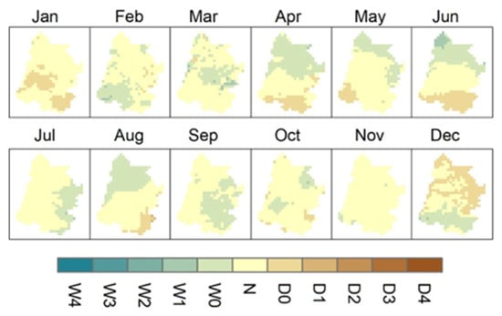 The results demonstrated a spatial pattern in drought appearance and disappearance. The southern part of the UCRB is the first area affected by drought, and the disappearance of drought is also initiated from this area. Woodhouse et al. (2006) [45] also indicated that the southern portion of the UCRB gained a measure of drought relief in the winter of 2004–2005. The less evident spatial pattern and a mixture of drought categories in the UCRB are associated with the nature of the HADI, which reflects the anomalies in different hydroclimatic variables.