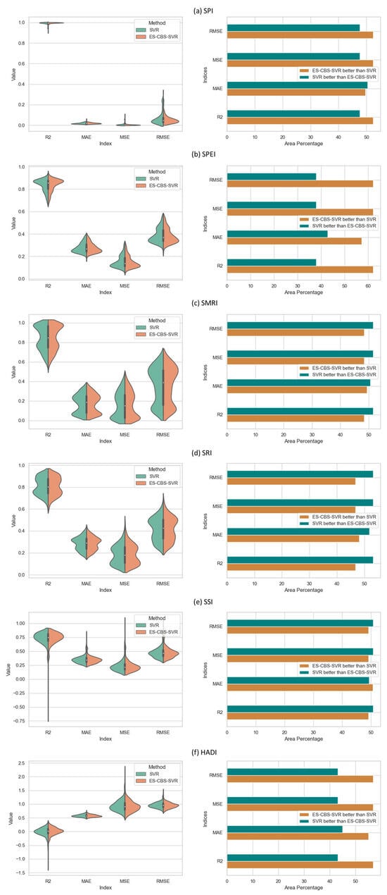 Comparison of the performances of SVR and ES-CBS-SVR for (a) SPI, (b) SPEI, (c) SMRI, (d) SRI, (e) SSI, and (f) HADI. The graph on the left side for each drought index is a violin plot, while the horizontal bar graph represents a comparison of the number of grids in the study area with accurate predictions for each drought index.
