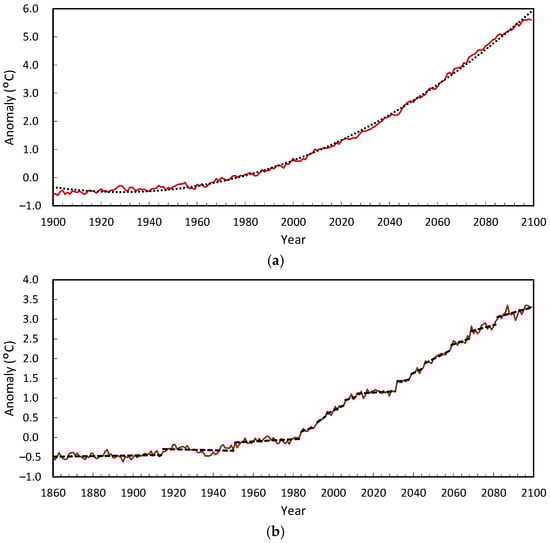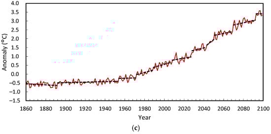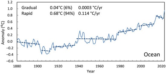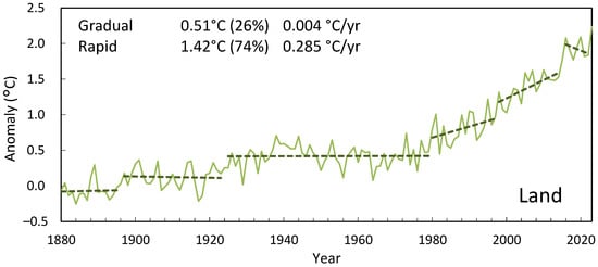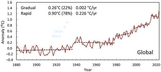 The magnitude of gradual change in each time series is also too small to explain the changes attributed to radiative forcing based on trend analysis. The likely change from 1850–1899 to 2010–2019 is 0.8 °C to 1.3 °C, with a best estimate of 1.07 °C []. For the NOAA data, it is 0.99 °C, whereas the gradual component for 1880–2022 is 0.26 °C. Even though these two periods are offset and measured differently, when 1850–2019 is calculated the same way, gradual warming totals 0.24 °C and rapid warming 0.79 °C for a total of 1.03 °C.