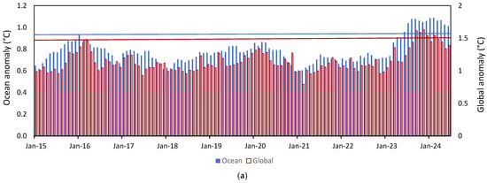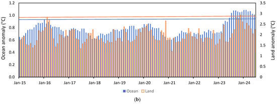 Figure 4 compares monthly SST and GMST (Figure 4a) and SST and LST (Figure 4b) from 2015 to June 2024. From January 2015 to February 2023, the month before SST started to spike, trends for all three were negligible and slightly negative. The peak temperature for the 2016 El Niño was January 2016 for SST (0.93 °C from the 1850–1899 baseline) and February 2016 for GMST and LST (1.47 °C and 2.83 °C, respectively). These levels are shown by the horizontal lines in each chart.
