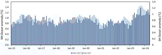 Monthly anomalies January 2015 to July 2024 from a 1850–1899 baseline of NOAA Global Surface Temperature v6, comparing NH and SH SST.