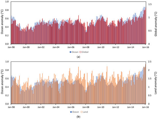 Monthly anomalies January 1998 to January 2016 from a 1850–1899 baseline of NOAA Global Surface Temperature v6, comparing (a) SST and GMST and (b) SST and LST.