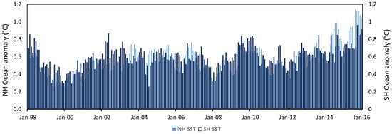 Monthly anomalies January 1998 to January 2016 from a 1850–1899 baseline of NOAA Global Surface Temperature v6, comparing NH and SH SST.