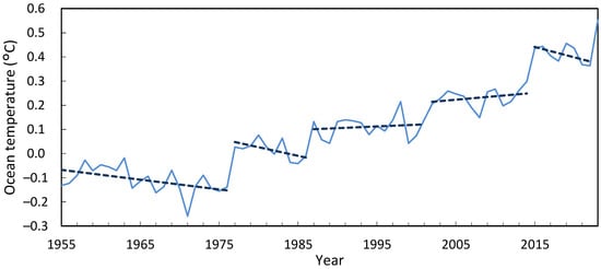 Figure 8 shows regime shifts in the upper ocean for 1955–2023, with shift years occurring in 1977, 1987, 2002, 2015 and most recently in 2023. They coincide with SST except for 2002. The annual temperature increases between 2014 and 2015, and 2022 to 2023 mark the largest and fourth largest in the record, while those of 1977 and 1987 are the second and third largest. The 1987 shift affected mainly the northern hemisphere but was widespread; its global impacts are documented by Reid et al. [].
