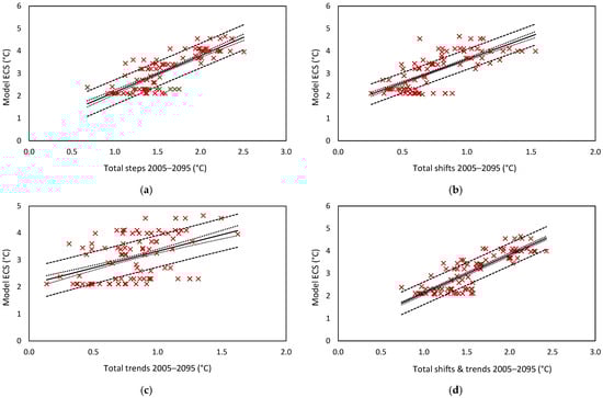 For the whole series (n = 94), the proportion of results falling within each confidence interval were steps 72/94, shifts 54/94, trends 42/94, and shifts and trends 66/94. Steps, shifts and trends (Figure 9a–c) all fell within their respective confidence interval in 21 of the 94 runs. Twenty of these had ECS values of 2.4–4.0 °C (20 from 47). This indicates that as a group, models with mid-range estimates of ECS were more consistent.