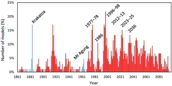Figure 10 shows a histogram of regime shifts in the model ensemble driven by historical emissions to 2005 and RCP4.5 thereafter. Two eruptions, Krakatoa and Mt Agung, produced negative shifts. The second half of the 20th century record shows higher skill than the earlier period. From the 1970s, the peaks coincide with the regime shifts in GMST to 2005, as shown Section 3.1.1, with the addition of 1986, which affected mainly the NH. From 2006, Figure 10 shows a peak in 2012–2013 of 13%; a subsequent peak in 2023–2025 of 13%, 15% and 12%; followed by a peak in 2036 of 13%, with 10% of models shifting in the two years either side. The ensemble predicted the 2014 shift a year or two early, although some tropical records registered a shift in 2013. It also predicted the most recent event. A total of 14 models in the ensemble registered a shift in 2023, 16 in 2024 and 13 in 2025.