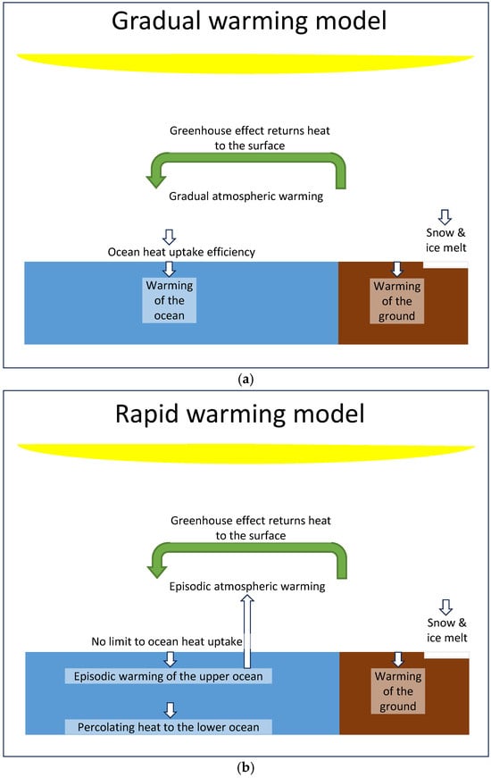 This paper proposes a third alternative. It builds on previous work that identifies the climate response on decadal timescales as being a nonlinear process [,,,,,,]. Under this model, radiative transfer theory remains unchanged, but the heat accruing due to increasing greenhouse gases follows a different warming pathway. Instead of gradually warming the atmosphere and shallow ocean, additional heat is absorbed by the ocean while the coupled upper ocean and atmosphere maintain steady-state conditions. When the heat buildup in the shallow ocean becomes unstable, sea surface temperatures undergo a regime shift emitting heat into the atmosphere, causing rapid warming [,].
