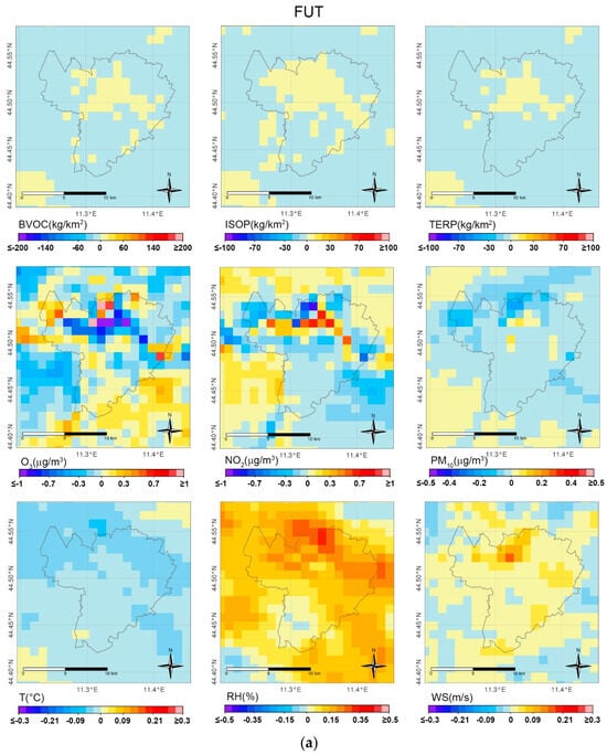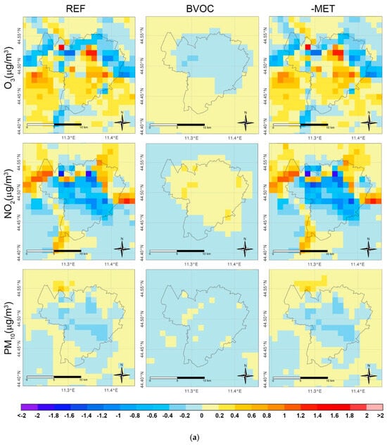 The amount and distribution of the monthly sum of BVOC, ISOP, and TERP emissions, which contribute to changes in pollutant concentrations (Figure 2 and Figure S1), are shown in the first two columns of Figure 1a,b [11]. Comparing Figure 1b in [11] with Figure 2, it is evident that the distribution patterns of BVOC, ISOP, and TERP emissions do not resemble the patterns of pollutant concentrations displayed in the latter, despite their high values during summer. A similar observation was made for January, comparing Figure 1a in [11] to Figure S1, although this was somewhat expected due to the significantly lower BVOC emissions during winter. Thus, on monthly basis, in both summer and winter, O3, NO2, and PM10 concentrations exhibit minimal variability due to vegetation emissions; the local effect of BVOC emissions is counterbalanced by physical and chemical processes. However, it is worth noting a slight increase in PM10 concentrations in the northeastern part of Bologna (Figure 2a), corresponding to an area with increased TERP emissions, more evident in January than in July: Figure 1a in [11] vs. Figure 2a.