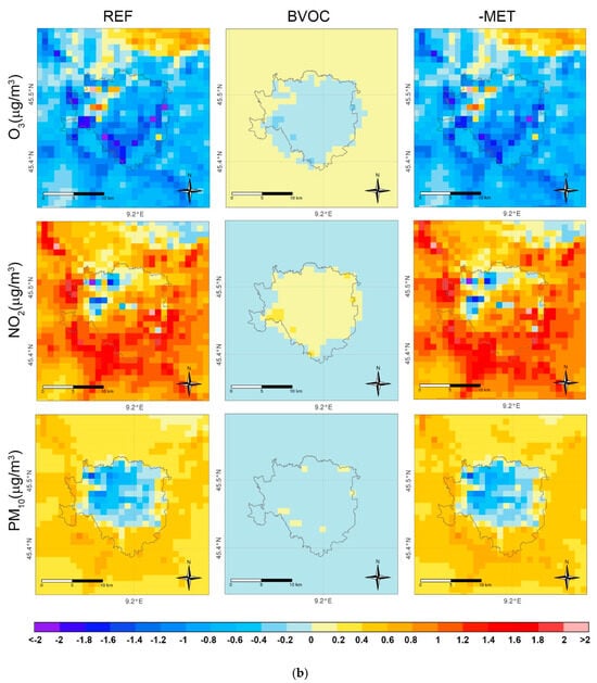 In Milan, the (-MET) effect contributes to a decrease in O3 almost throughout the city, with reductions of up to approximately −2.36 mg/m3 (Table 4a). This decrease in O3 is associated with a corresponding increase in NO2, reaching up to 2.16 mg/m3, due to O3 consumption (more details in [11]).